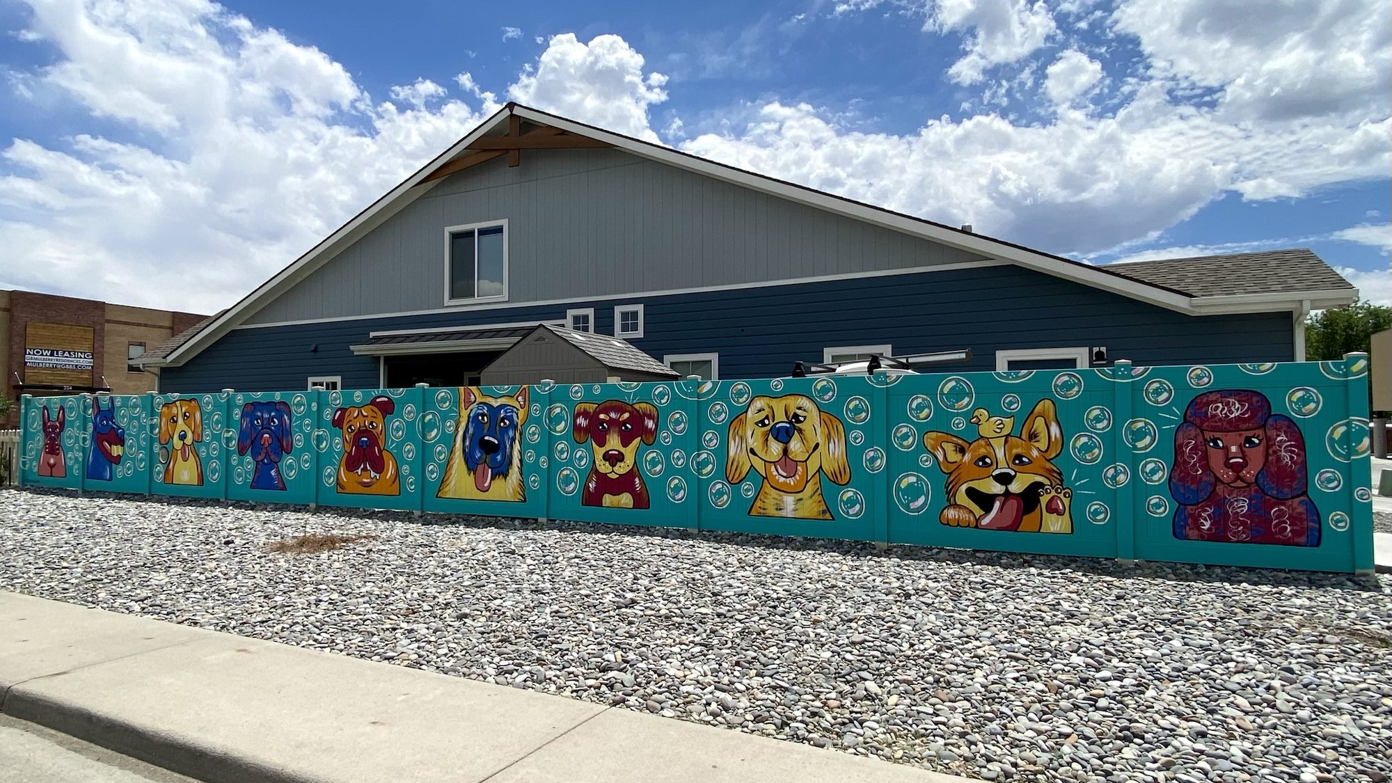 1,000 sq ft, Acrylic Paint on vinyl fence, located at Kiss My Mutt in Fruita, CO, 2023